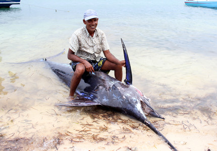 “We caught this Black Marlin near the Addu buoy, it gave a good fight, took more than an hour to pull it. 3 of us couldn’t lift it into our boat, so we tugged it to shore. Looks like it’s 10 feet across and would weigh between 250kg-300kg”